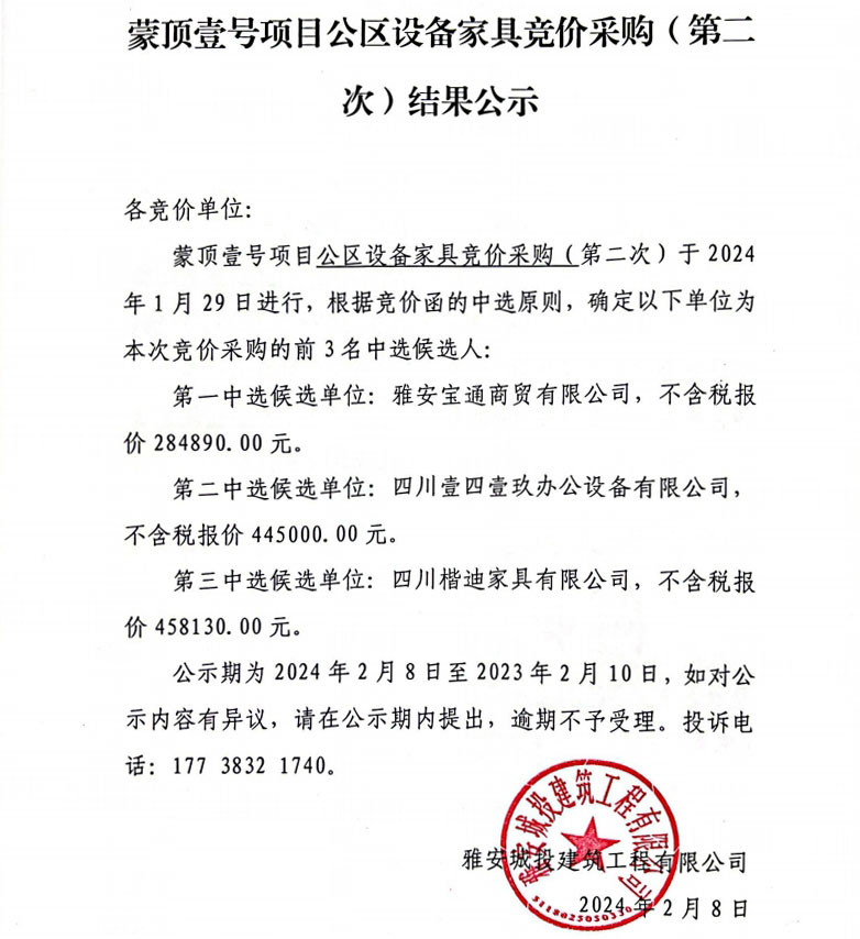 蒙頂壹號(hào)項(xiàng)目公區(qū)設(shè)備家具競(jìng)價(jià)采購(第二次)結(jié)果公示