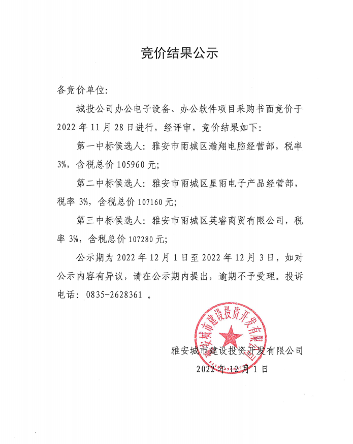 雅安城市建設(shè)投資開發(fā)有限公司辦公電子設(shè)備、辦公軟件項(xiàng)目采購(gòu)競(jìng)價(jià)結(jié)果公示