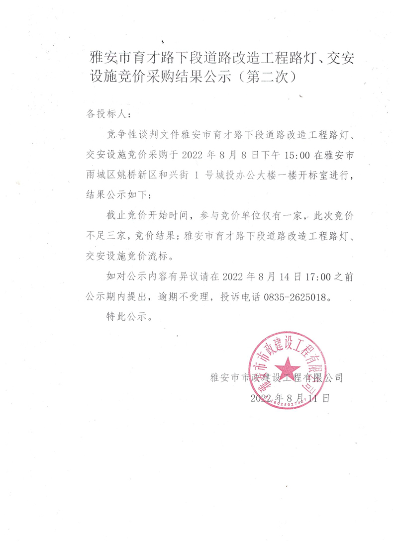 雅安市育才路下段道路改造工程路燈、交安設(shè)施競價采購結(jié)果公示(第二次)