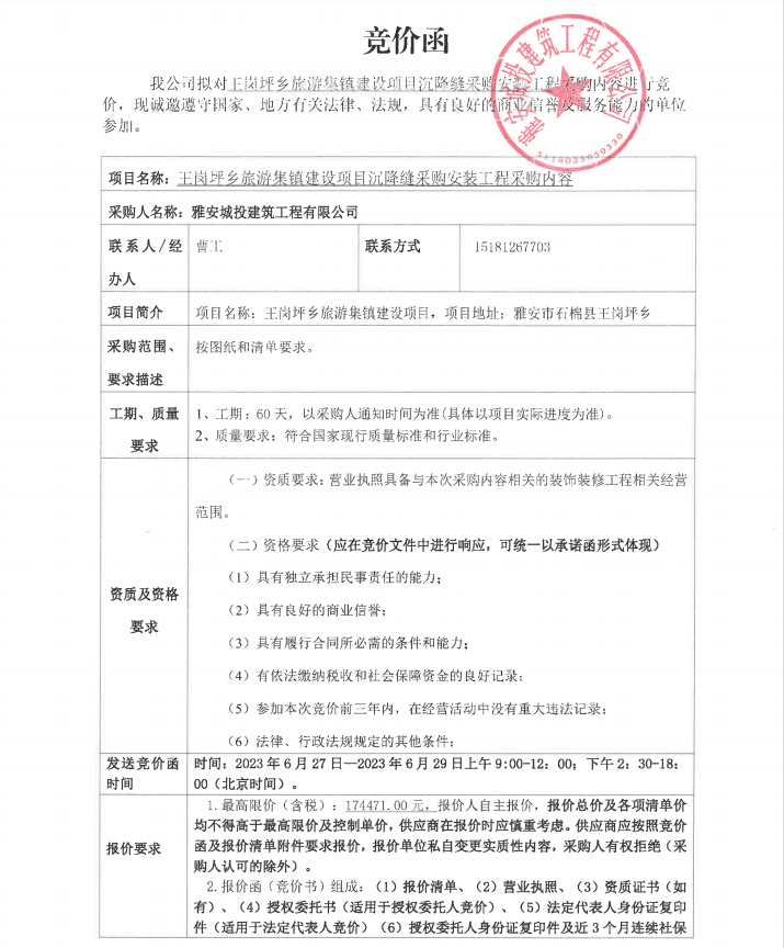 王崗坪鄉(xiāng)旅游集鎮(zhèn)建設項目沉降縫采購安裝工程采購內(nèi)容競價公告