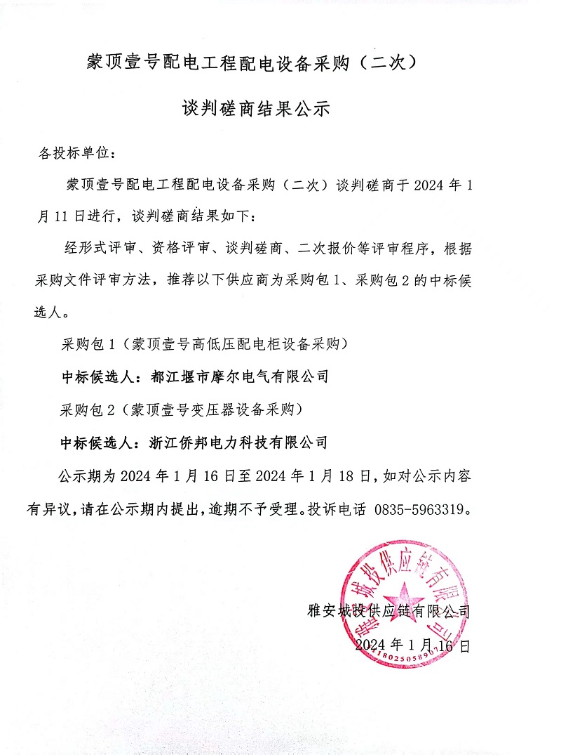 蒙頂壹號(hào)配電工程配電設(shè)備采購(二次)談判磋商結(jié)果公示