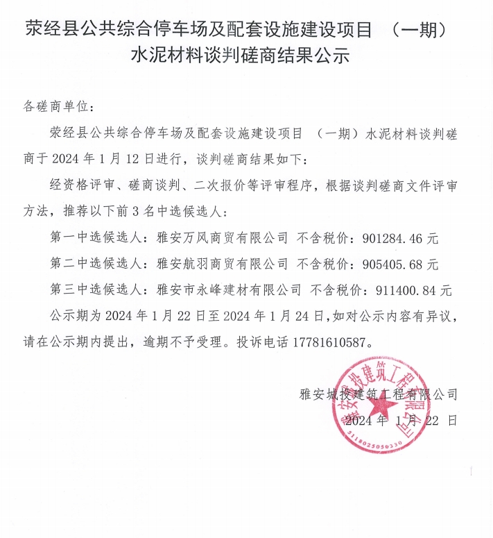 滎經(jīng)縣公共綜合停車場及配套基礎(chǔ)設(shè)施建設(shè)項(xiàng)目(一期)水泥材料談判磋商結(jié)果公示