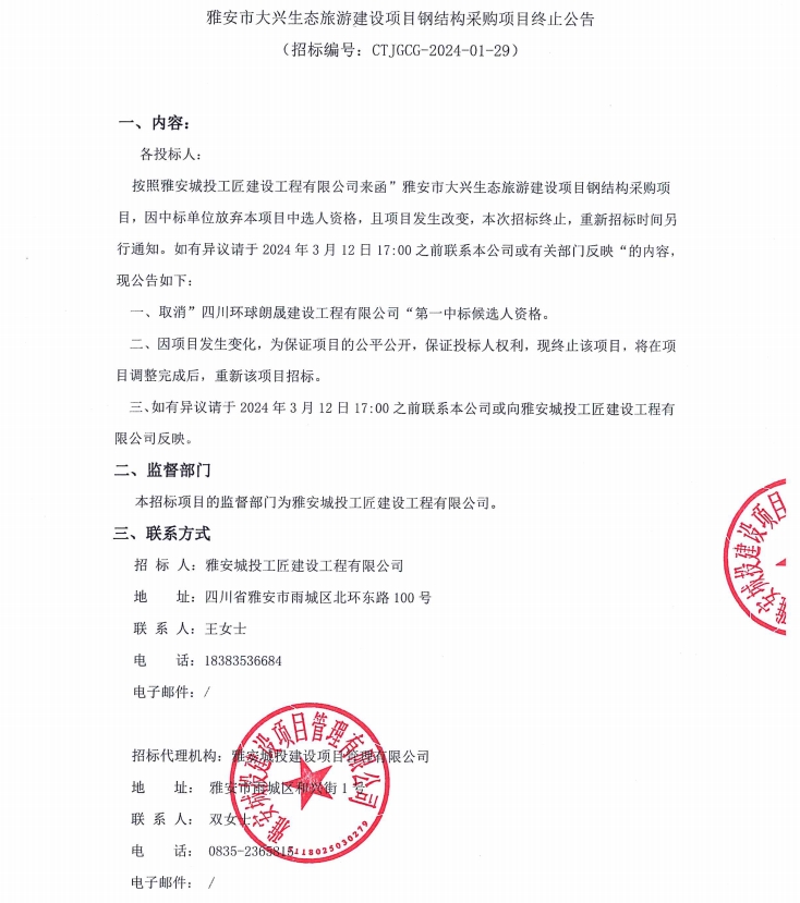 雅安市大興生態(tài)旅游建設(shè)項(xiàng)目鋼結(jié)構(gòu)采購項(xiàng)目終止公告