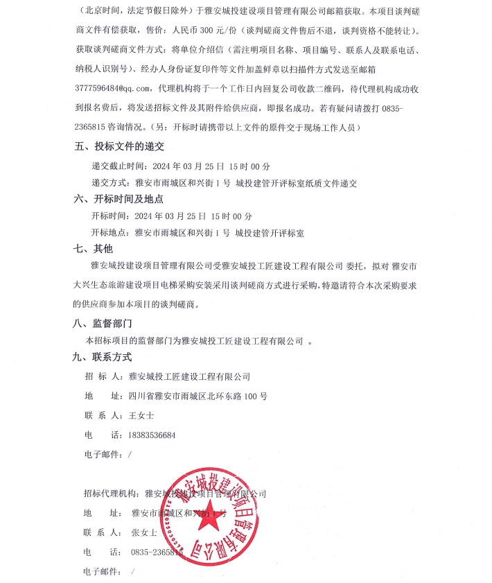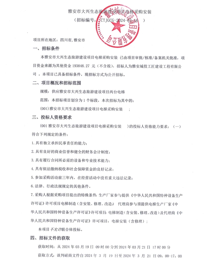 雅安市大興生態(tài)旅游建設項目電梯采購安裝公告
