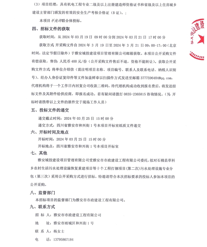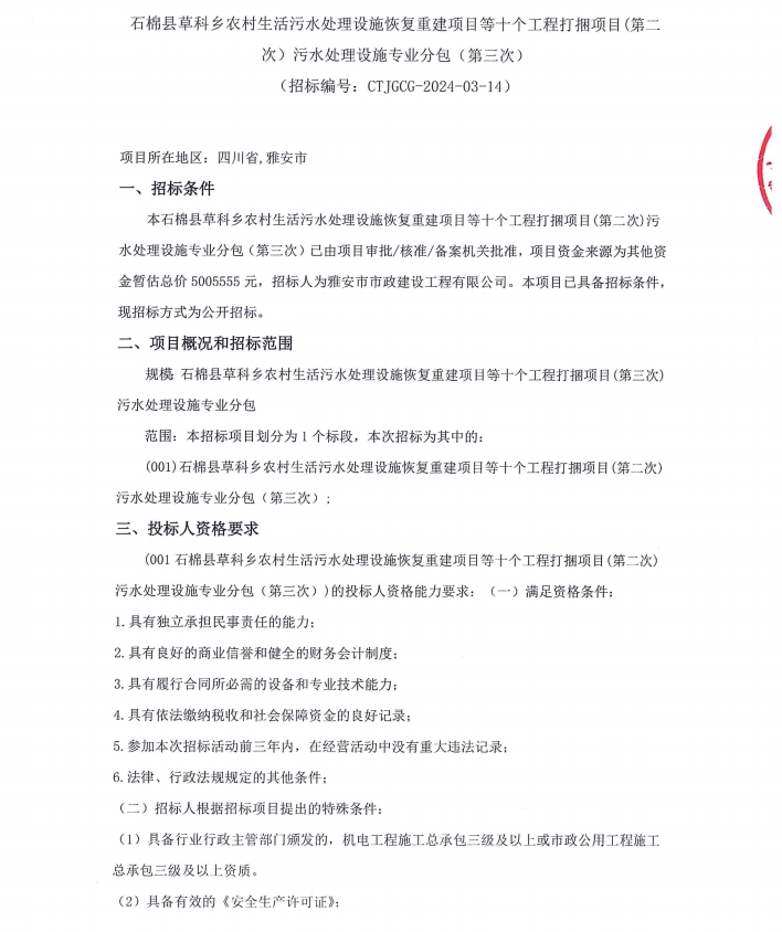 石棉縣草科鄉(xiāng)農(nóng)村生活污水處理設(shè)施恢復(fù)重建項(xiàng)目等十個(gè)工程打捆項(xiàng)目(第二次)污水處理設(shè)施專業(yè)分包(第三次)公告