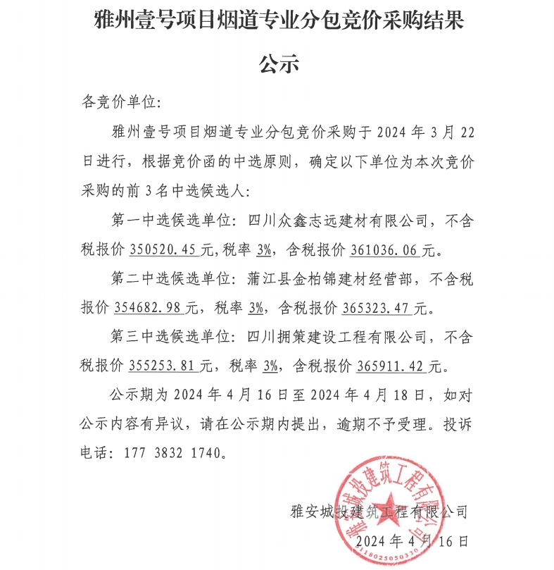 雅州壹號(hào)項(xiàng)目煙道專業(yè)分包競價(jià)采購結(jié)果公示