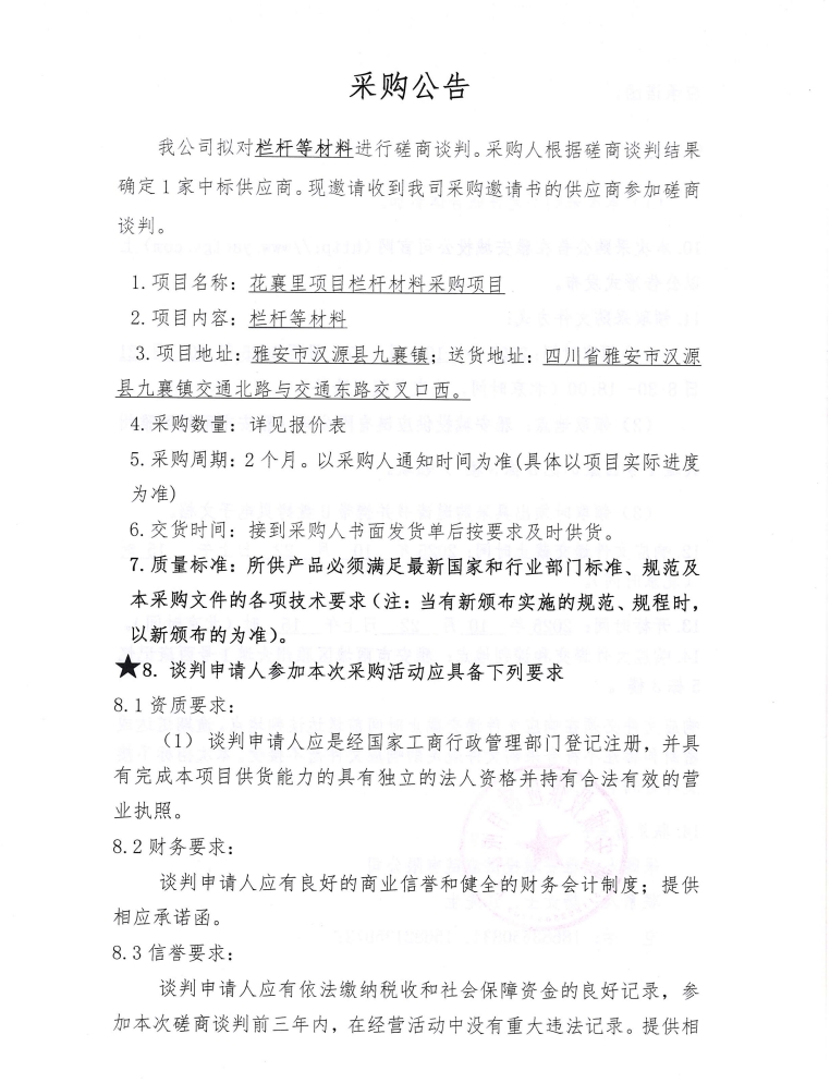 花襄里項(xiàng)目欄桿等材料談判磋商采購公告