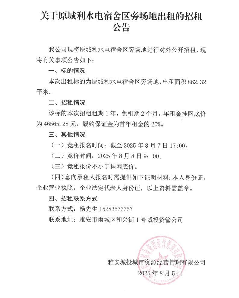 關(guān)于原城利水電宿舍區(qū)旁場地出租的招租公告